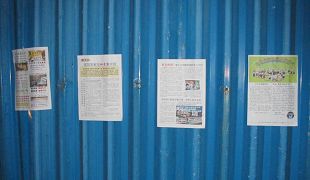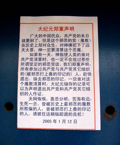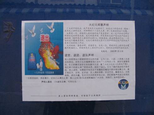 ![]() 张贴在奶生堂社区黑板报栏上的不干胶《大.纪.元;郑重声明》和三:退.签名单,供居民签名 |