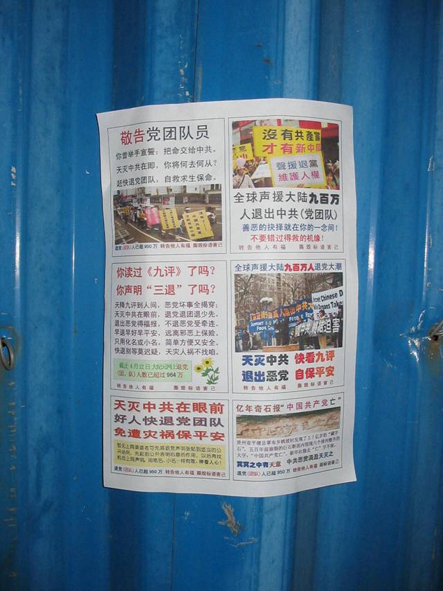 ![]() 张贴在奶生堂社区住宅楼门上的宣传画“天降《·九·评*共产党 邪恶本质大曝光》” | ![]() 张贴在奶生堂社区平房门口的“三:退.”宣传画 |