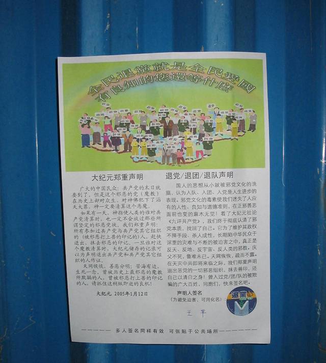 ![]() 张贴在城西水系附近工地上的不干胶“三:退.”宣传画 | ![]() 张贴在城西水系附近工地上的不干胶“全国退!党!就是全民爱国”及退!党!签名单,方便人们签名 |