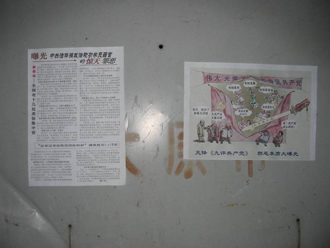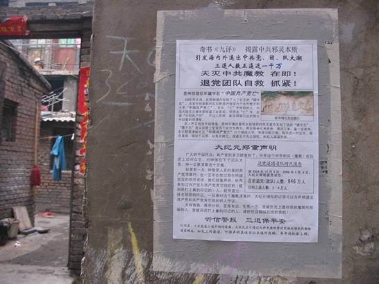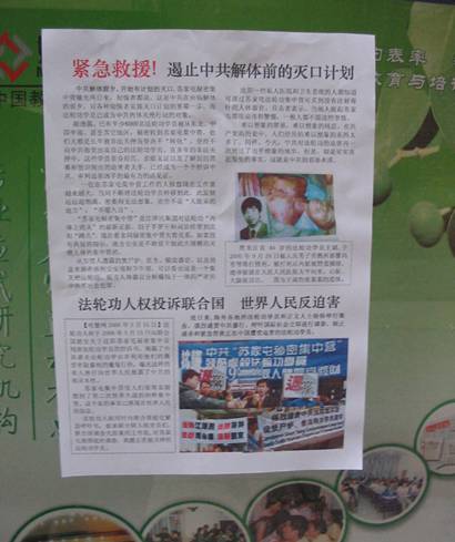 ![]() 贴在府西街汽车站广告栏上的光盘《2006年全球华人新年晚会》 | ![]() 贴在鱼池街一家商店门口的不干胶《曝光秘密集中营》 |