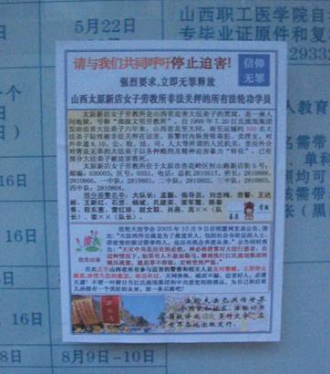 ![]() 张贴在太原市招生考试管理中心(太原市第十二中学校附近)的公告栏上的不干胶《强烈要求,立即无罪释放山西太原新店女子劳教所非法关押的所有法轮功学员》 |