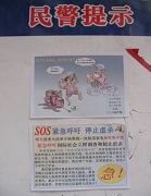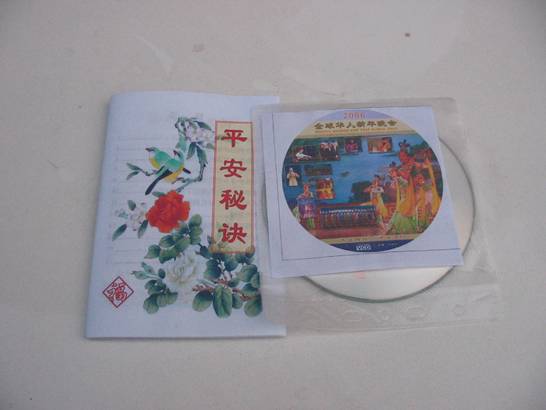 ![]() 张贴在水西巷通讯设施上的不干胶“SOS紧急呼吁 停止虐杀” | ![]() 放在傅家巷饭店露天小餐桌上的小册子《平安秘诀》和光盘《2006年全球华人新年晚会》 |