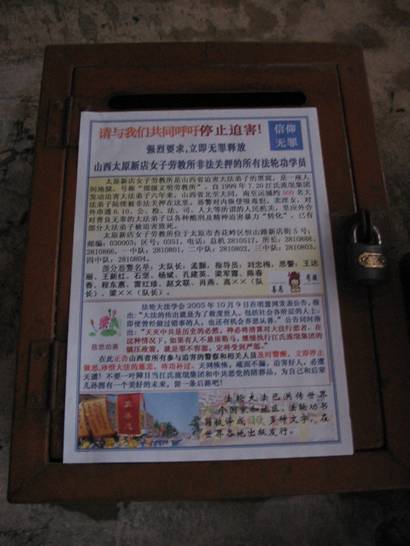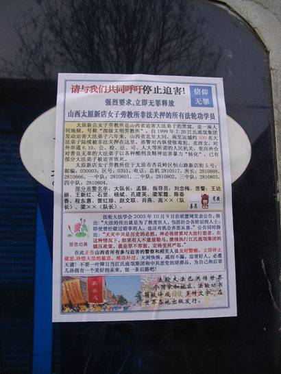 ![]() 张贴在奶生堂社区住宅楼里的不干胶《强烈要求,立即无罪释放山西太原新店女子劳教所非法关押的所有法轮功学员》 |