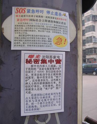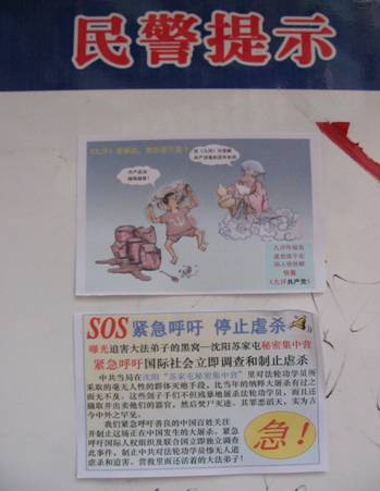 ![]() 张贴在半坡东街电话厅外的不干胶《曝光秘密集中营》、《SOS紧急呼吁 停止虐杀》 |