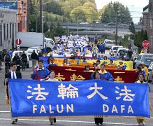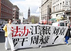游行中,法轮功学员打出了“法办江泽民、罗干、刘京、周永康”、“要求允许调查真相委员会赴中国劳教所调查真相”、“强烈谴责中国劳教所盗取法轮功学员活体器官的兽行”、“紧急呼吁制止中共法西斯暴行”等标语。