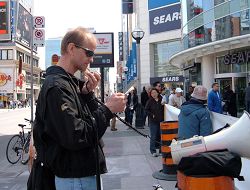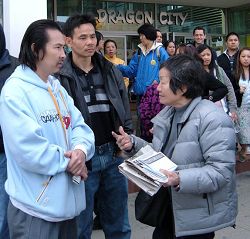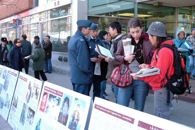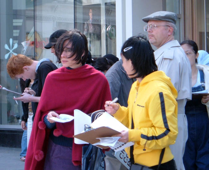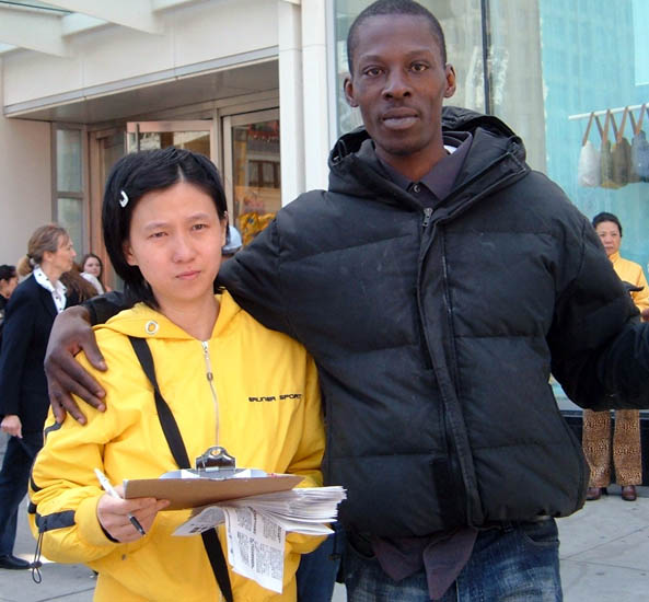 一位名叫Steven的黑人青年,听了学员的介绍后,激动的问学员说:“这么残酷的事情在发生,(中共)还杀了你们这么多人,你是什么感受?”学员难过的落泪。Steven就说:“我和你的感觉一样,他们不只是在杀你们的人,他们是在杀地球上的人,也就是我们大家的人。我一定会支持和帮助你们的。”接着他就拿着学员给的传单,到公共汽车站对等车的人们说:“那边在发生着很紧迫的事情,需要你们的帮助,请去给他们签名支持。”有不少人听了他的话后,都过去了解真相并签名。