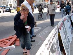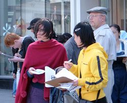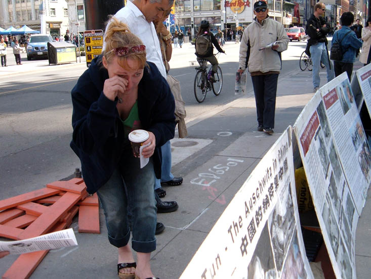 在登达士广场,一位匆匆走过的女士,当看到反酷刑展时停下了脚步。她在看展板的介绍时,惊讶的瞪大了双眼,双手抱头,惊呼:“上帝啊!这是怎么回事啊?上帝啊!我能做什么呢?”她流着泪在学员递上的签名表上签完名后,说:“我很想具体帮你们做点什么,我怎么帮你们呢?”学员就告诉她说:“你可以给总理和议员写信或打电话,还可以给美国的布什总统或联合国写信,紧急呼吁立即制止中共对法轮功学员的虐杀。”她回答说:“我一定会的。”