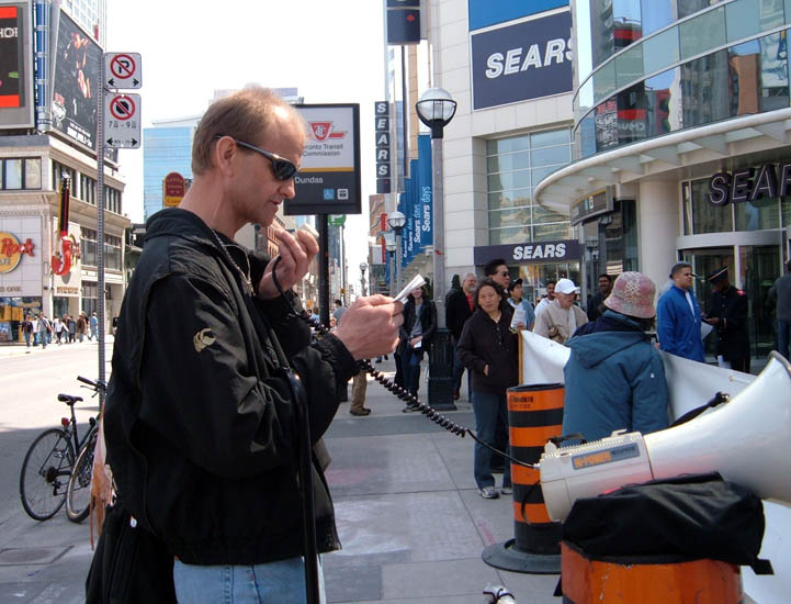 一位名叫Gerard的先生,仔细的看了酷刑模型和展板后,走过去对一直在用广播读真相文章的学员说:“你累了吗?我很想为你们做点什么,我想用我的声音来唤起人们的关注。我能帮你读吗?”在他的多次要求下,学员说:“你来读吧,谢谢你!”Gerard先生就大声的读《中国有三十六个集中营》,《没有人能活着出来》等真相文章。