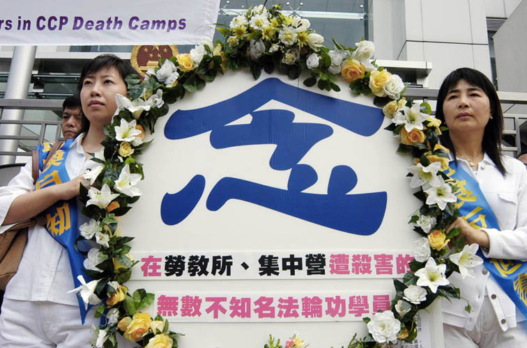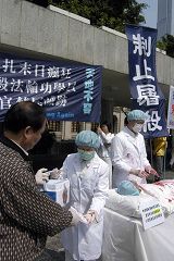 ![]() 在集会上模拟演示中共活体摘卖器官 |