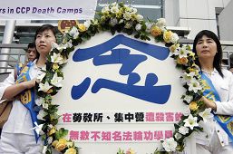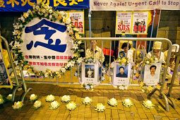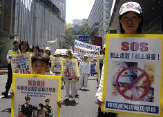 ![]() 法轮功学员在中联办外宣读声明 | ![]() 在中联办外悼念遇害的学员 |