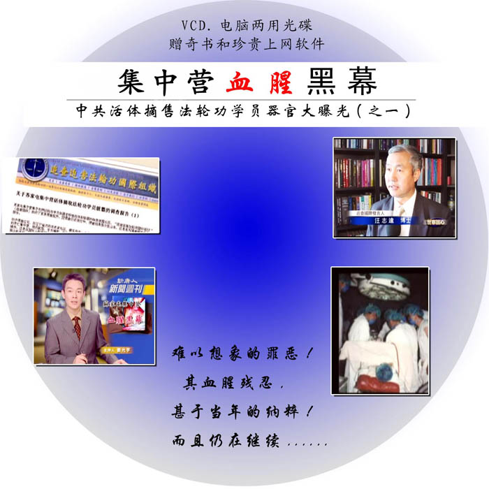 此盘面可用Epson R210或佳能IP3000、IP4000、IP4200等有打印光盘功能的彩喷打印机打印。考虑到有关暴行还会不断曝光,所以此盘面为“之一”。如需改为“之二”、“之三”或做一些其它改动,将此图调入打印机自带的光盘打印程序中,利用其相关工具,很容易做的。当然也可以直接用此程序从新制作更好的盘面。