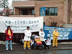 【明慧网2006年4月20日】2005年4月12日和4月18日上午,挪威法轮功学员两次来到中使馆对面,抗议中共在集中营和劳教所活体摘取法轮功学员器官的暴行。学员们打开横幅,炼功,向路人派发真相资料,并把抗议中共暴行的信放在了中使馆的信箱里。