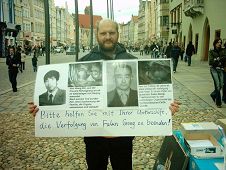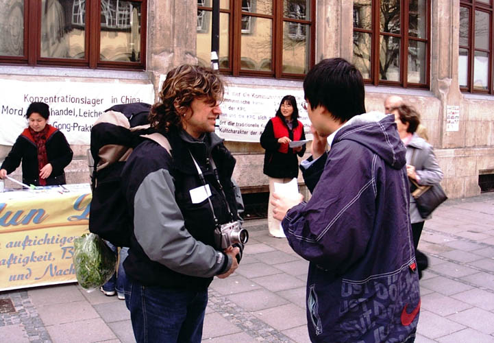 而在雷根斯堡市,营救活动一开始,法轮功学员就遇到一位德国男士,据他称,中共在德国派了100多个情报人员,有的还潜伏在法轮功学员当中。学员告诉他,对任何人我们都是用真善忍去对待,对中共的情报人员也同样,所以没有什么可担心的,要害怕的是那些干坏事的人。学员又告诉那位男士,现在形势已经不同了,近1千万人的退!党!表明:貌似强大中共已经在崩溃的边缘了。同时学员还给那位男士揭穿了中共欺骗全世界的几个典型的谎言:比如没有共产党,中国就会乱;中国经济的强大靠共产党的领导等。