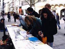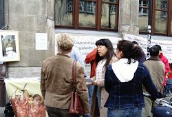 因为雷根斯堡的营救活动以请愿名义申请,原本规定不能用扩音器。而当治安警察了解到该活动的性质时,临时给了特殊许可。就这样法轮功信息中心的媒体通告不停的向大街上来往的人群铿锵有力的播放着。不少人听到消息,收住前行的脚步,来信息台前关注详细情况,并签名抗议中共对法轮功学员的残酷虐杀。也有人表示要致信德国政府,呼吁关注此事。还有的是刚听了朋友说了,特地赶来也要签名。