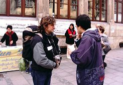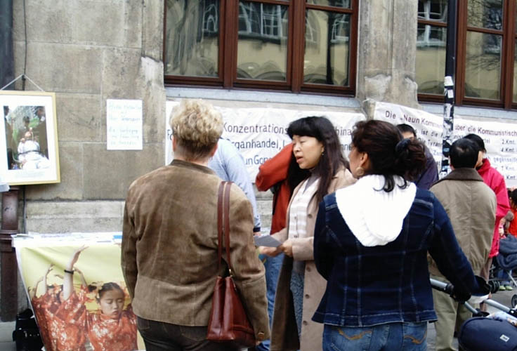 ![]() 兰茨胡特的法轮功学员手持展板向人们讲述迫害真相 | ![]() 法轮功学员向过路人讲真相 |