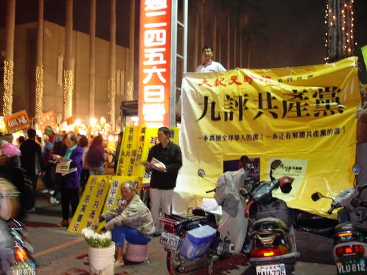 2005年6、7月间连续九个周六的晚上,在嘉义市中正公园举办“·九·评*共产党座谈会”,每晚放映一段“·九·评*”影片,并广邀专家学者参加座谈,市民纷纷结伴观赏,那段时间“·九·评*”内容几乎成为街谈巷议的热门话题,市民对中共的邪恶本质有了更透彻的了解,进而也更认识到中共迫害法轮功的残暴。一位共和路东市场的菜贩,在看了“·九·评*”影片以后,在菜摊上用手写的方式每天向群众公布退(共产)党人数,并经当地记者在报上披露,一时传为美谈。
