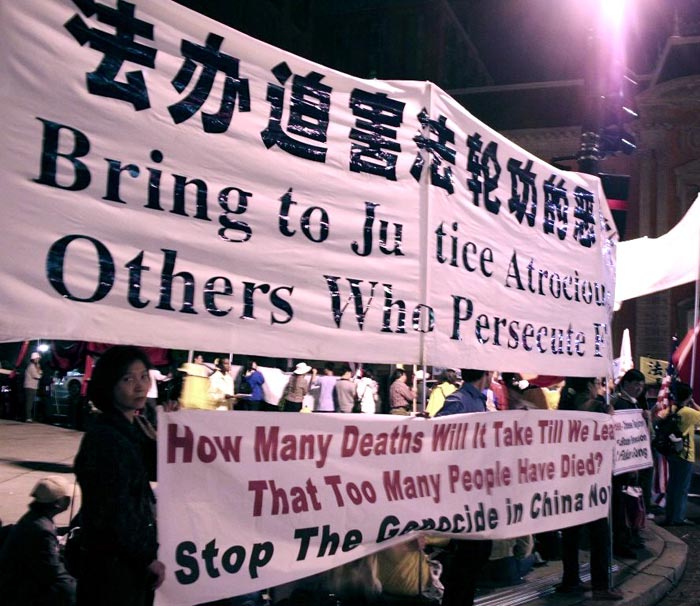 这时几个街角的法轮功学员用高音扩音器向在场的中国人播放“·九·评*”,学员慈悲,平和,有力的声音穿透了夜空,在场的中国人似乎都被震住了;本来他们还时不时的用扩音器放一放“革命歌曲”,喊一喊“爱国”的口号,但这时他们都在静静的听着。