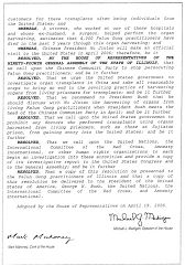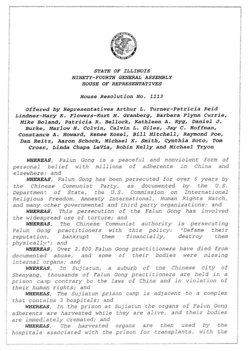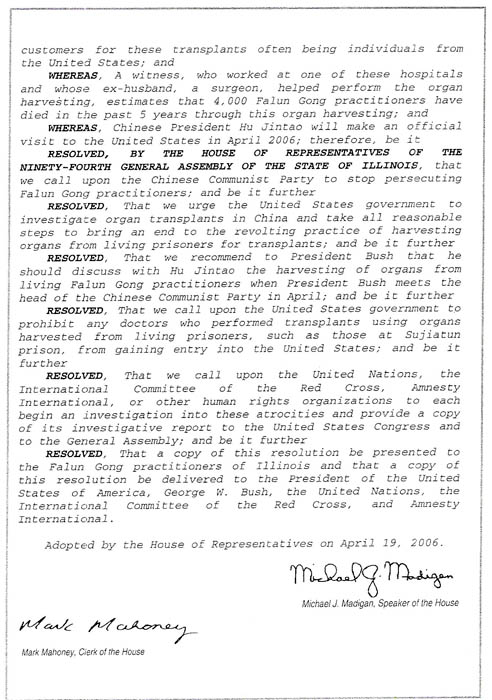 决议:将此决议文一份副本交与伊利诺伊的法轮功修炼者,并分别送达一份副本给美国总统乔治•W•布希、联合国、国际红十字会和国际大赦。