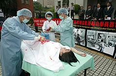 法轮功学员并以行动剧模拟中共政权活体摘除法轮功学员器官从中牟取暴利的情况。法轮功学员也集体手持在中国遇害的学员遗像及抗议布条,呼吁制止中共活体摘除学员器官暴行。