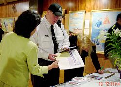 州府工作人员汤姆 (Tommy) 的女朋友在前一天晚上看完法轮功真相光盘后,带着她的一位朋友前来参观。她说她以前没想到天安门自焚是假的,真相光盘里慢镜头分析非常清楚明白。法轮功这么好却遭到如此惨烈的迫害,她看着光盘就忍不住哭了。最后,她希望能够尽快修炼法轮功。
