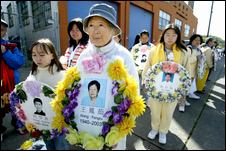 ![]() 从洛杉矶来参加游行的胡莉莉手持一张王凤茹的遗照,据其所述,王在一所集中营中遭到虐杀。 |