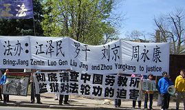 ![]() 胡的车队在法轮功学员高呼“法轮大法好”、“停止迫害法轮功”声中,以及“彻底清查中国劳教所、监狱对法轮功的迫害”和“法办江泽民、罗干、刘京、周永康”等横幅前经过,进入机场西侧门。 |