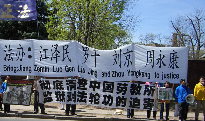 1点左右,胡的车队离开耶鲁大学,在法轮功学员的大横幅前经过。在康州Bradley Memorial国际机场西侧一军用货运机场旁边,也有部份法轮功学员到此打横幅。胡的车队在法轮功学员高呼“法轮大法好”、“停止迫害法轮功”声中,以及“彻底清查中国劳教所、监狱对法轮功的迫害”和“法办江泽民、罗干、刘京、周永康”等横幅前经过,进入机场西侧门。