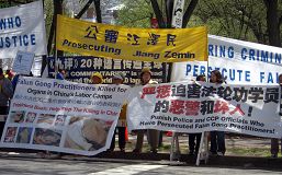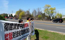 Sprague 大厅两侧的交通要道不但横幅林立,法轮功学员们还拿着各色真相展板、图片向过往的行人、维持秩序的警察以及中共的“欢迎”的人群讲述着大法的美好、中共7年来对法轮功的残酷迫害,特别是最近曝光的中共大面积活体摘除法轮功学员器官这一灭绝人性的罪行。