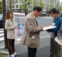 学员们用高音喇叭控诉中共残酷迫害的罪行,声音回荡在国会的上空,一出地铁就可以听见,加上从远处就可以看到的大型横幅和图片看板,令往来的国会议员、执勤的警察、参观国会的日本各地和海外的游客、行人,观之动容。一些学员散发报导中共劳教所和集中营暴行的特刊,一些学员征集签名支持到中国劳教所独立调查活体摘除法轮功学员器官的真相,还有一些学员直接访问众议院或参议院会馆的议员办公室,请求议员的帮助。