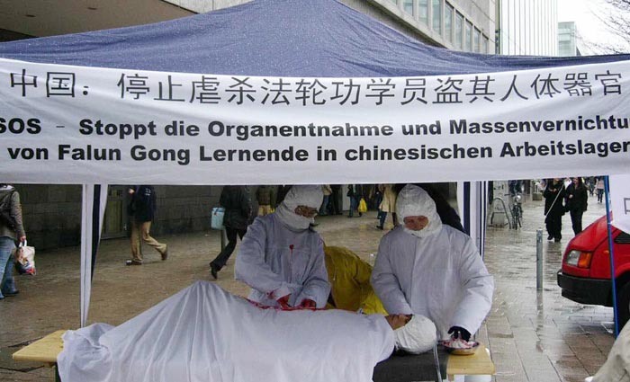 法轮功学员于2006年4月22日在德国北部海港城市汉堡市中心以真人模拟的方式揭露中共活摘人体器官的兽行,以呼吁民众的关注。细雨中,学员打出横幅:“停止虐杀法轮功学员盗其人体器官”,“停止迫害法轮功”,“呼吁全面调查中国劳教所和监狱”。