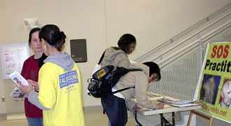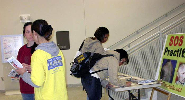 【明慧网2006年4月24日】2006年4月11日,美国辛辛那提大学部份师生在Tangeman University Center举办征签活动,呼吁布什总统帮助调查中共劳教所活体摘取法轮功学员器官一事。听闻在中国发生的这一惨绝人寰的对法轮功学员的,几乎每一位经过的老师和学生都立即在请愿书上签下自己的名字。甚至还有几位学生主动帮助去校园周围征签。短短几个小时就征集了600多的签名。