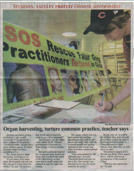 下午,校报 (News Record) 的记者赶来拍照和采访,并在第二天的校报头版上报导了这次征签活动,让更多师生了解到了在中国发生的这一活体摘取法轮功学员器官的罪恶行径。