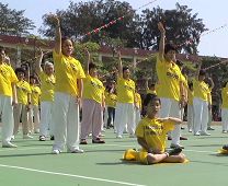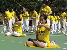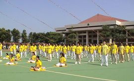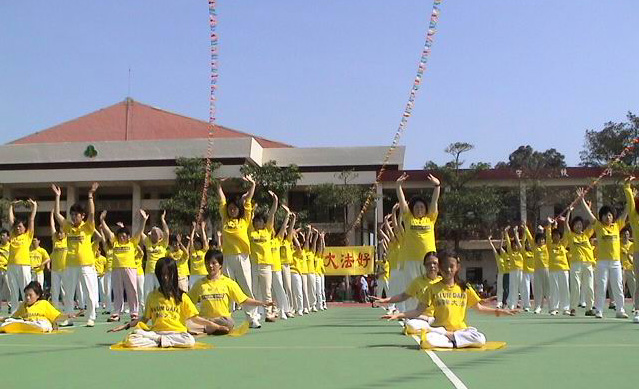 到场表演的法轮功学员约有70位,在操场上排开后显得气势非凡,配合优美的炼功音乐,整齐划一的动作,使得运动会原本喧嚣热闹的气氛也顿时跟着沉静下来。功法表演中只听到法轮功炼功的音乐如同天际传来的声音,将整个运动场罩在祥和的氛围中。