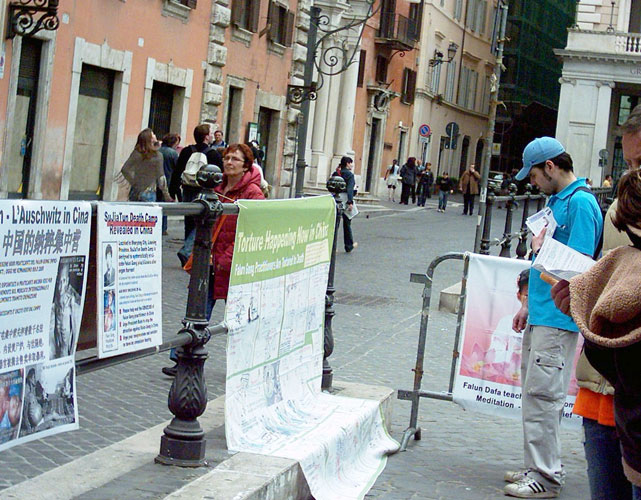 【明慧网2006年4月25日】2006年3月以来,多位证人揭露在中共劳教所和监狱里发生的对法轮功学员活体器官摘除以牟取暴利的兽行后,罗马法轮功学员持续在意大利总理府前和罗马市中心的帝国大道揭露中共的罪恶,呼吁意大利政府和国际社会关注此事,并帮助制止中共的暴行。此外学员们还打出横幅,声援千万民众退出中共。