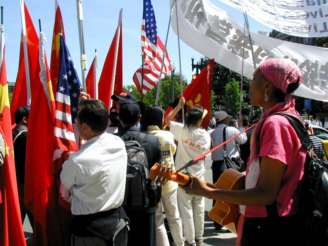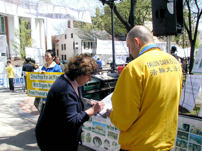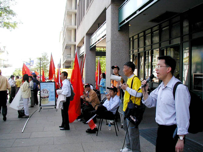 2006年4月,在中共党魁前来华盛顿的时候,来自世界各地的许多法轮功学员云集华府,举行了声势浩大的游行和抗议活动。同时中共也下了血本,雇用了大量的学生和美国华人,前来欢迎胡。对法轮功学员们来说,这是一个讲真相的好机会,因为欢迎的人群和法轮功学员都在一起,很多学员抓紧时间跟那些中国人讲真相。许多人被眼前的法轮功的声势震惊了,天灭中共的景象就在眼前。许多过路的美国人、政府要员为眼前的景象而感到震撼,他们停下来观看横幅和展板,媒体穿梭在人群中,忙着采访。