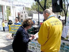 那位女士接着说:“后来有一位中国人抱着孩子来到我跟前,他看了图片,说真是太残忍了。我告诉他关于中共对法轮功学员实行群体灭绝,他们甚至将法轮功学员活体摘除内脏。那位男士说那就是在犯罪,我又告诉他,孩子手中拿的红旗是用千万同胞的血染成的,千万不要让孩子再拿了,他答应着离去了。后来我又看到他了,我注意到孩子手上真的没有红旗了。”
