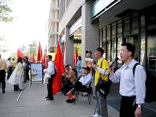 19日,中共党魁到达的当天,法轮功学员用高音喇叭播放《·九·评*共产党》第七评——“评中共的杀人历史”。一开始那些欢迎的人还在叫嚣、谩骂,可当播到中共的历届总书记几乎都被中共杀掉了的时候,人群一下子安静下来了,都在静静的听,不少人离开队伍坐到后面的咖啡馆里去听了。