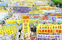 ![]() 周日,在台湾,成千上万的法轮功学员在台北的街头抗议中共对法轮功的迫害。(台北时报图片) |