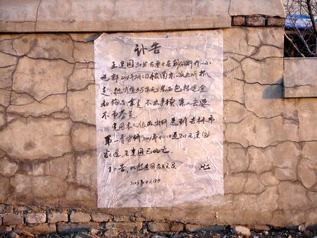 自那日起王家的亲朋好友、左邻右舍、十里八村的乡亲闻讯相继赶来吊唁,好多人都给大法弟子王建国上香,甚至是附近干活的一些民工听到消息后都来看布告和大门上挂着的“真相展板”。尽管王建国家很偏僻,但是往来的车辆还是停下来看布告和被迫害者的冤情分析。吊唁的村民们大多数都流着泪说:这孩子死的太冤了!这么好的孩子就给迫害死了,这共产党完了。有的村民还说:我们以前听到炼法轮功的被迫害死以为都是假的,现在知道了原来这些都是真的……。