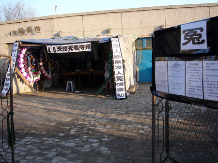 布告内容:“王建国30岁与妻子在朝阳街开一小吃部。2006年3月2日被南京派出所抓走,把价值三万余元东西包括现金和物品拿走,不出手续,亲人去要不予答复。王建国本人被派出所送吉林市第一看守所,2006年4月11日,通知王建国的家属,王建国已死亡,布告以慰建国在天之灵。”家属把布告贴到大门外,让所有的人都知道王建国的冤情,已告天下。灵棚搭起的那天,天阴沉沉的,骤然冷了下来,天空中飘起了雪花……