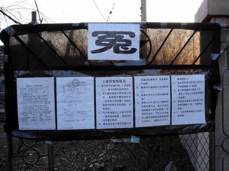 王建国被南京派出所酷刑逼供后劫持到吉林市看守所,遭到野蛮灌食,4月10日被迫害致死。4月13日王家在自家院内搭起了灵棚,以慰建国在天之灵。在院子的大门上挂着“真相展板”—— 内容是两份自相矛盾的王建国死亡病例,还有王建国被吉林市看守所迫害致死的诸多冤情疑点。当天很多家属聚在一起,在悲愤之余不修炼的家人拿笔写了几份布告。