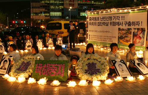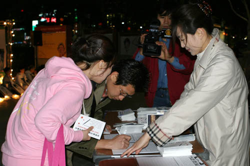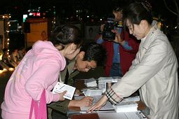 ![]() 韩国市民惊愕于活体摘取器官的中共的兽行,纷纷参与‘反对中共对法轮功学员的人权迫害’的声明纸上签名 |