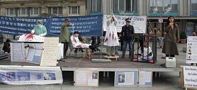 一位当年曾去天安门广场为法轮功和平呼吁而遭中共警察抓捕的德国学员向民众讲述了她在中国的经历。她当时在天安门广场遭抓捕后被关押在机场附近的一家宾馆里。说是宾馆,其实里面全是中共的警察,就是一所伪装下的警局。当她要求接听电话时被拒,手机被强行没收。当她强调她应有的权利时,警察回答她:“你是在中国,你就没有权利”。这位学员后来回到了德国。但她告诉台下的德国民众,千千万万的中国法轮功学员还生活在被迫害中,他们的情况很危险,他们很需要你们的帮助。稍后另一中国法轮功学员也讲述了其在中国因分发法轮功真相材料被非法关押16个月的亲身经历,以呼吁德国民众帮助停止中共对法轮功的迫害。