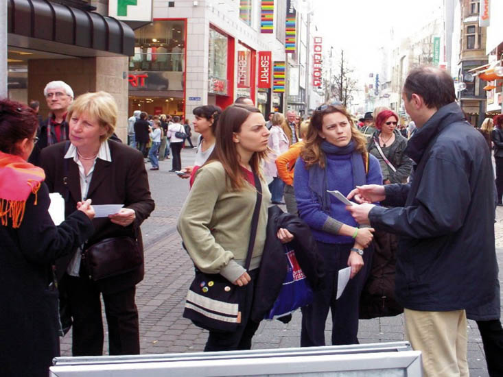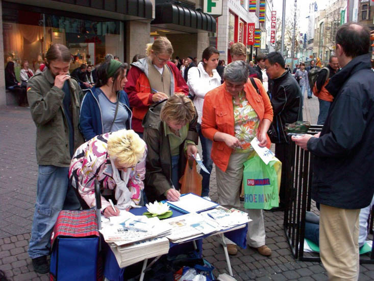 购物中的行人们纷纷停下脚步,仔细阅读每一张展板、每一份材料,并向法轮功学员询问更多的情况。中共的暴行让人们震惊了。中国是德国人现在的热门话题。电视里几乎每周都有关于中国的报道,街上到处是made in China(中国制造)的商品。德国人都知道中国的经济地位提高了,却不知中国的人权情况一再恶化。震惊之余,人们纷纷签名,希望能为制止迫害做些什么。