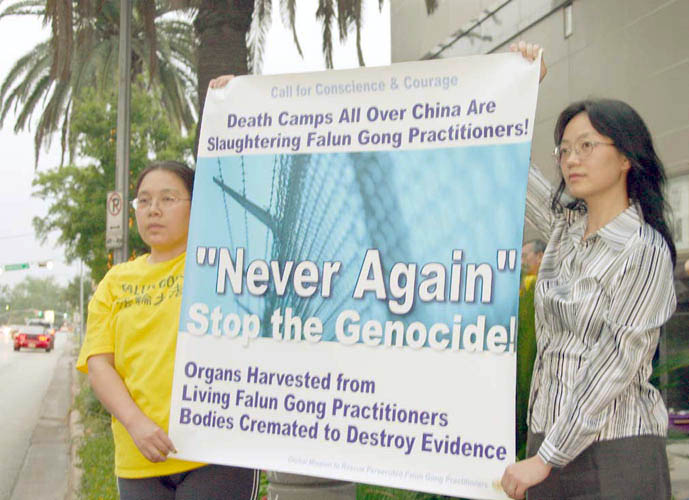 中领馆前,法轮功学员悬挂起呼吁制止迫害法轮功的横幅,坐在草坪上静静的炼功、发正念。马上,有一辆车停在学员的前面,车里的人开始发问:“这是为什么?”他们随后将车停在了停车场,要求马上告诉他们真相,他们对横幅上写着的“器官”、“集中营”不理解,因为正巧他们就是心脏器官移植的医生,学员迎上去,向医生介绍在中共集中营活体摘取法轮功学员器官的罪行。他们问的非常详细,当他们明白之后,他们想要法轮功学员穿的黄T恤,把它挂在诊所,让更多的人知道真相。其他的行人也被这严肃、静穆的场面吸引住了,开始询问这是为什么?法轮功学员迎上去,向行人讲真相,发放资料。
