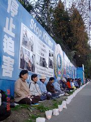 当天傍晚,法轮功学员来到中领馆前,其中有七旬老人、孕妇和孩子,他们点燃蜡烛,以一贯的平和方式静静坐在那里,纪念“4.25万人上访中南海”7周年。