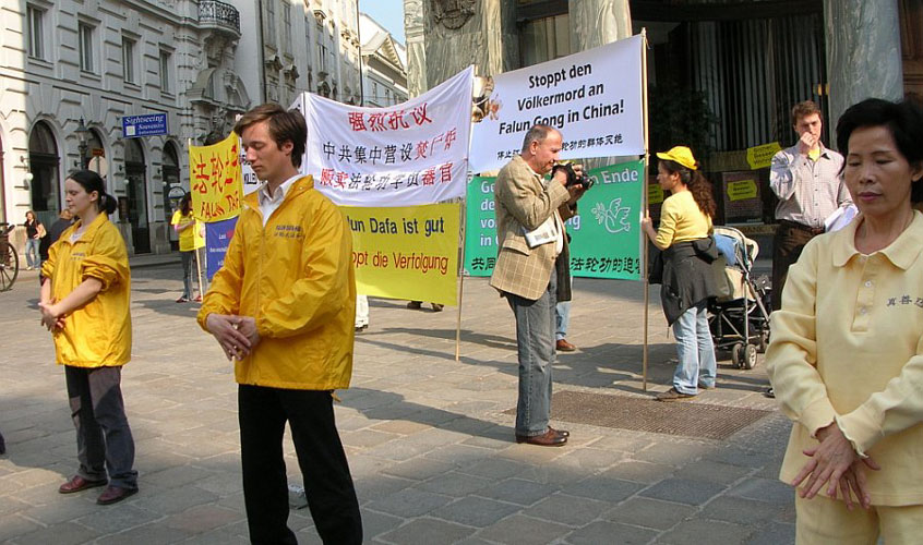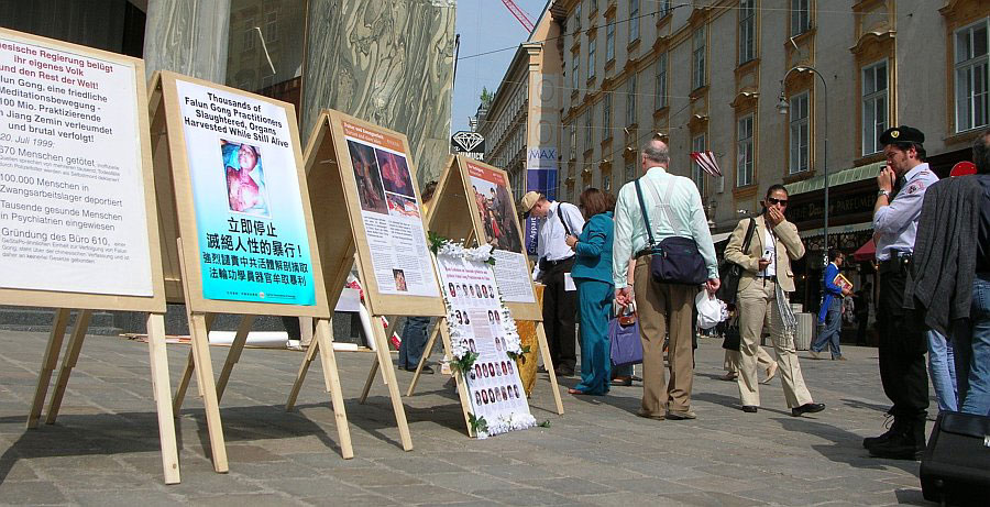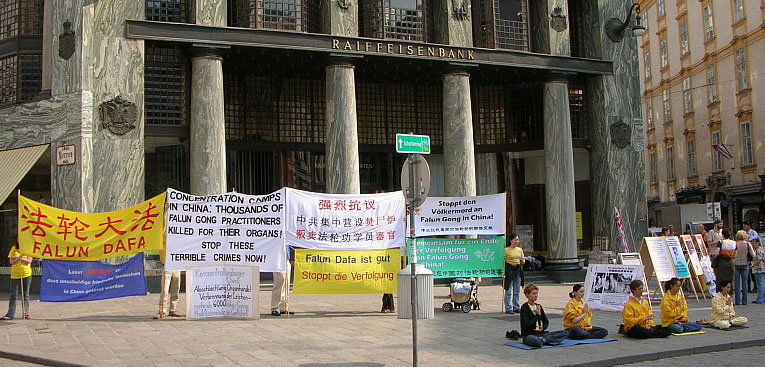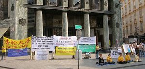 法轮功学员在举行会议地点的不远处举行活动,抗议中共对法轮功学员的残酷迫害。学员们打出的横幅写着:制止中国的劳教所活体摘取法轮功学员的器官,進行非法买卖。