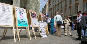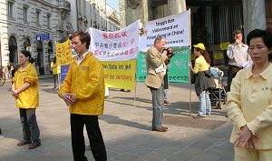 一位中年本地女士走到信息台前,对学员说:你们必须把这个消息告诉联邦总理,他正坐在拐角的咖啡馆。学员走到餐厅,正好联邦总理和外交部长都坐在那里。学员们把关于中共暴行的传单和法轮功真相传单送给了他们。