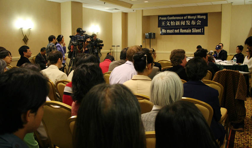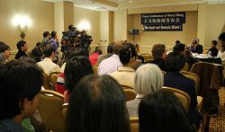 法轮功发言人张而平先生代表法轮大法信息中心在新闻发布会上发言。他说,罗莎•帕克思女士、马丁•路德•金和圣雄甘地,都是被我们人类称颂和推崇的人。我们不可能在讨论他们的行为时不讨论他们为什么这么做的背景。王文怡的举动是出于个人的良知,应该受到人们的尊重。中国的法轮功学员,仅仅因为不放弃自己的信仰,就被监禁、酷刑,甚至活着摘取器官牟利。试想你的儿女、母亲被推向手术台活着摘除器官,你会保持沉默吗?王文怡这个身材瘦小的两个孩子的母亲,用自己的行为大声疾呼停止屠杀,她应该象罗莎•帕克思女士一样被人们尊重。