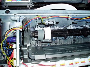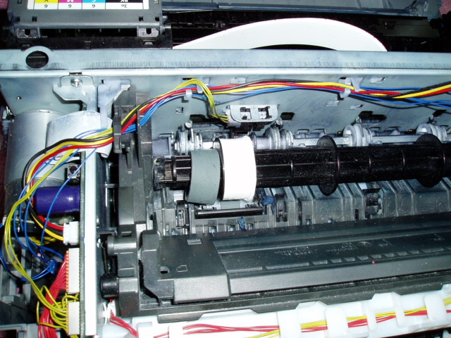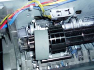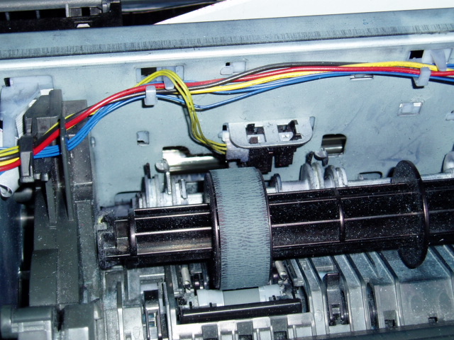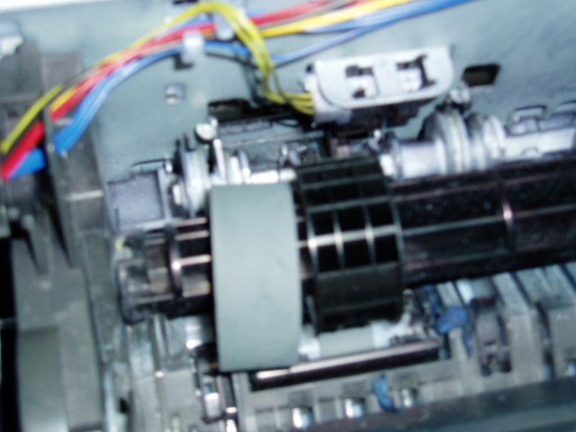 把机器两侧的外壳卸下,再拿下上面的机壳,图1,可看到大搓纸轮,把搓纸轮上的胶皮扒向一边,图2,再在搓纸轮上缠上一圈医用白胶布,图3,再把胶皮从新套上即可。安上机壳,试机,完毕。